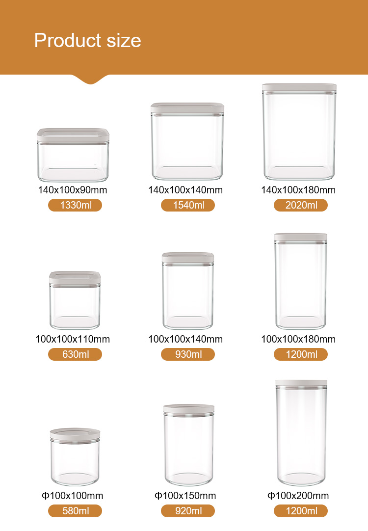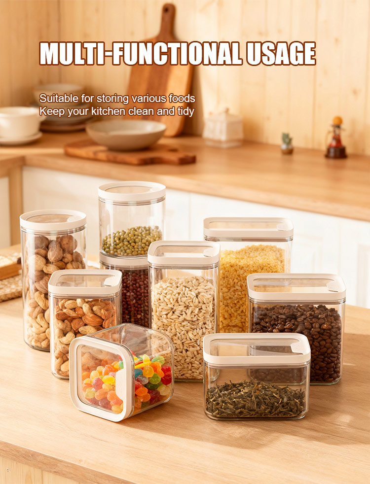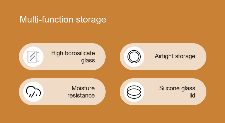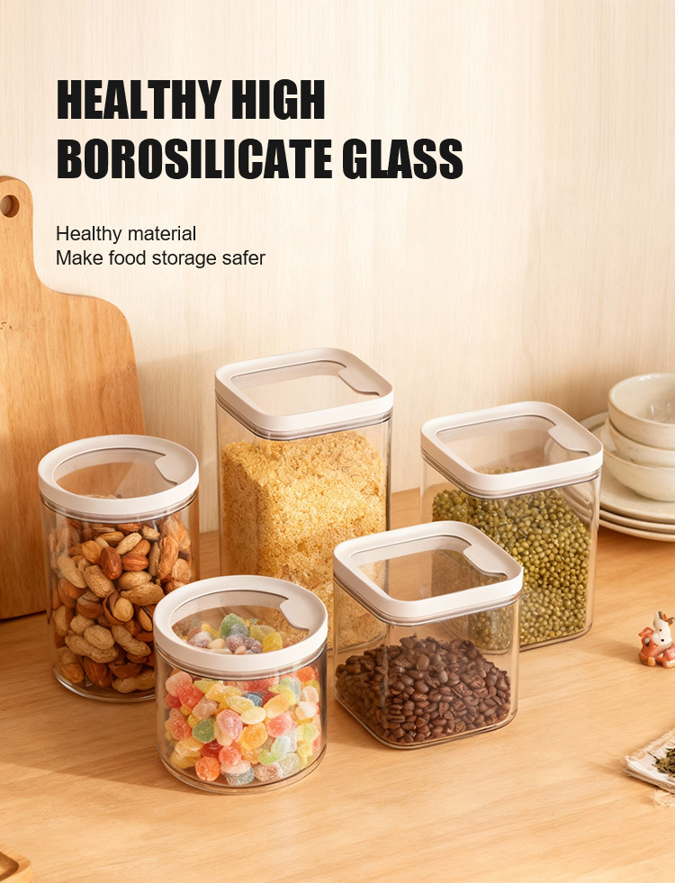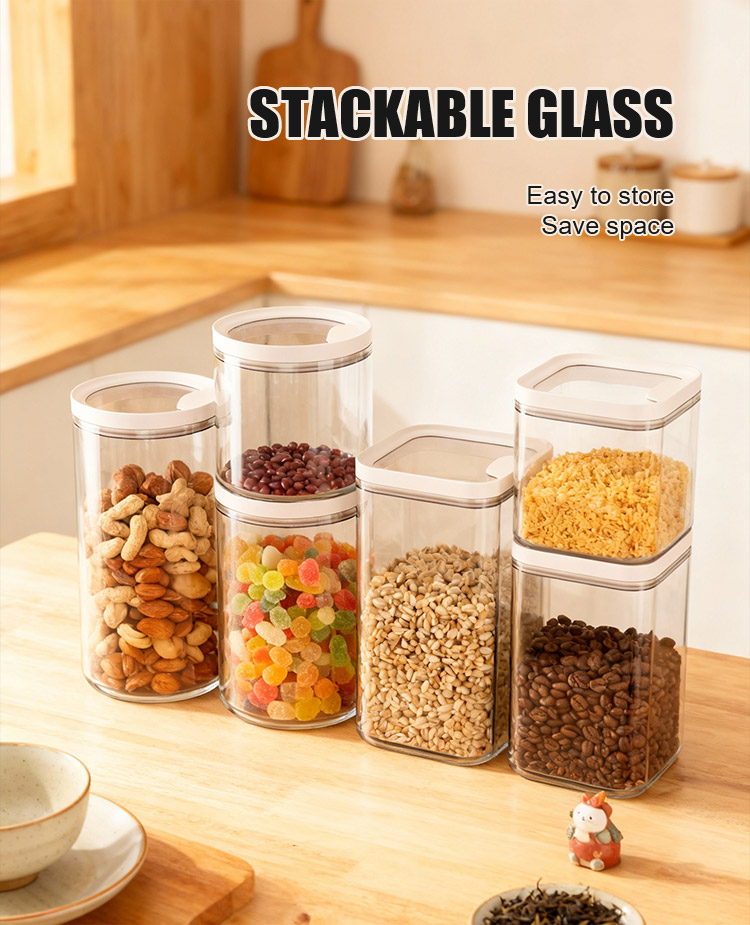 Die Gläser variieren in Größe und Form (hoch zylindrisch, niedrig rechteckig und quadratisch) und bieten so flexible Aufbewahrungsmöglichkeiten für alles von Mandeln und Rosinen (wie auf den Produktbildern gezeigt) bis hin zu Kaffeebohnen, Teeblättern, Süßigkeiten und Gewürzen. Dank des stapelbaren Designs lässt sich der Platz in Schränken oder Kühlschränken optimal nutzen, während die minimalistische Verpackung mit weißem Hintergrund die klare Glasdurchsicht und die eleganten Silikondeckel hervorhebt.